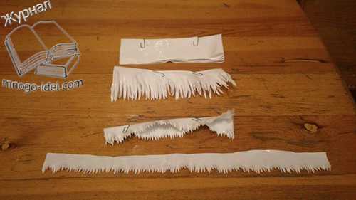 Теперь будем делать полосочки бахромушки для собачки из полиэтиленовых пакетов. Используем для этого все что найдём у себя дома, это может быть плёнка, пакеты, разные упаковки, молочные пакеты и т.д. Вход пойдёт все, а если будут разные цвета у пакетов, то можно придумать интересный окрас нашему песику. Ольга использует плотные молочные пакеты, с них смывает краску и вперёд. Краска с молочных пакетов смывается очень хорошо, а если у вас есть ещё и губка меламиновая, то вы вообще быстро все смоете. Но можно использовать и обычные пакеты, только смотрите чтобы они не были совсем тонкие, а иначе они быстро придут в негодность и весь наш труд будет напрасен.