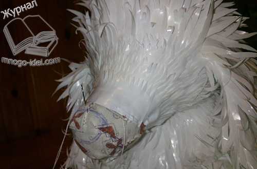 Один диск режем пополам (крылья), второй чуть скрепляем сверху (тело). Соединить с помощью клея тело и крылья. Голову вырезать из третьего диска, на нее наклеить глазки. Красками нарисовать волосы, рот, нос и украсить одеяние. Пришить веревочку.