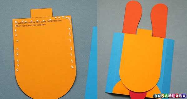 К синей подложке приклеиваем желтый полукруг. Вставляем в разрез склееные язык и уши.