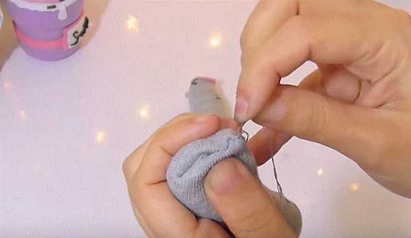 30. Там где находится палец — мы пока не пришиваем. В это отверстие набиваем синтепух и формируем объем мордочки.