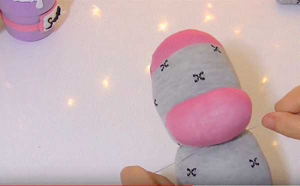 32. Берем крепкую нить в несколько слоев и сразу под мордочкой перетягиваем ее поперек туловища. Это будет голова.