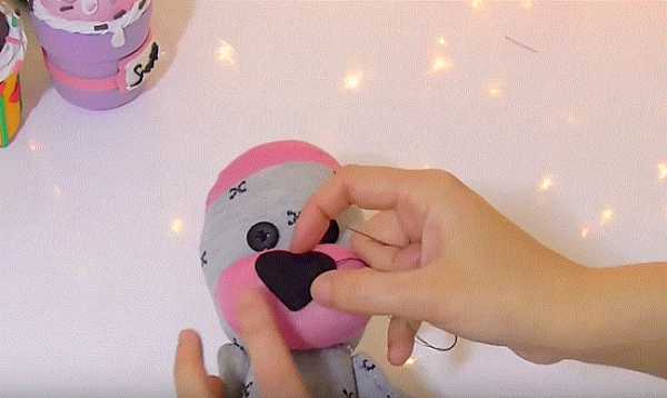 40. Из черной ткани вырезаем носик в виде сердечка и примеряем его к мордочке.