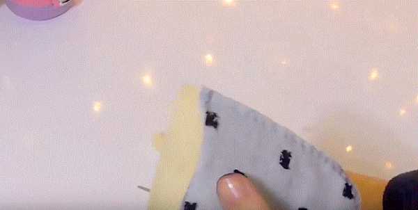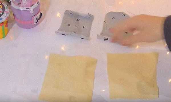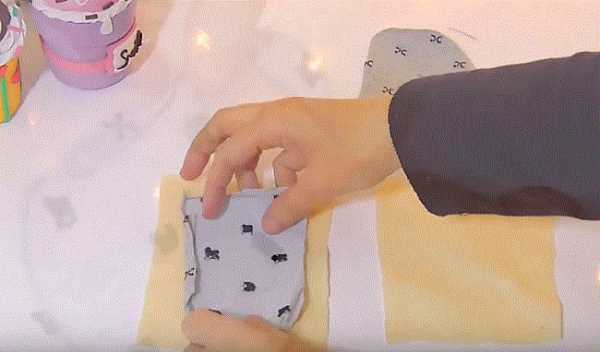 47. Кладем готовую выкройку ушей лицевой стороной на желтую ткань.