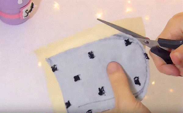 48. Подгибаем ткань выкройки и пришиваем к желтой ткани по всему контуру, кроме прямой части.