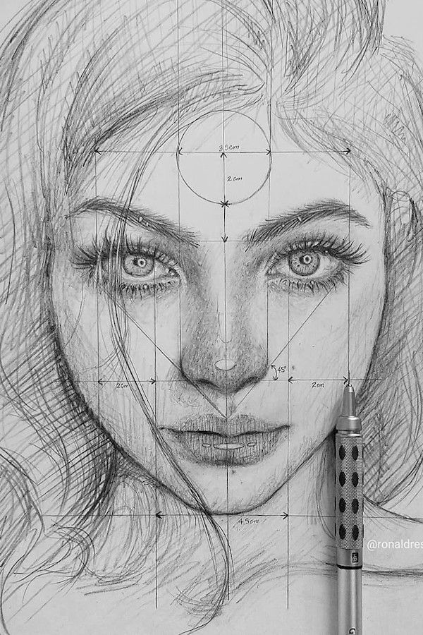 Правильное построение при рисовании портрета основывается на измерении черт лица модели и расстояния между ними.