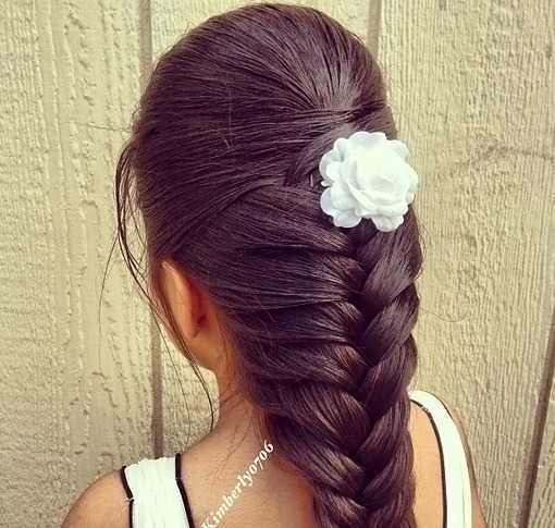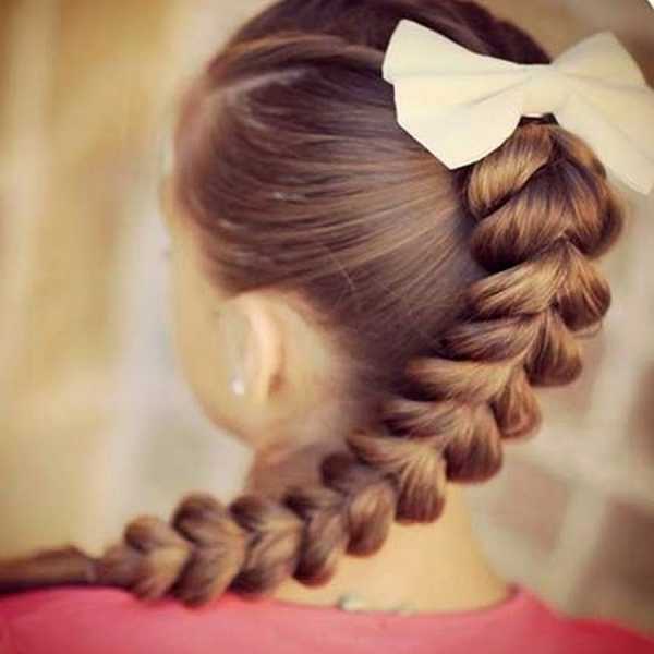 Если завить нижние пряди и добавить большой аксессуар, то прическа подойдет для выпускного. В более простой вариации, как на фото выше, для детского сада. Выполняется просто: начните плести косичку как французскую, то есть вплетая волосы. После вплетения первый прядей, начните плести как обычную косичку. Повторите еще 2-3 раза и закрепите косички резинкой или бантом.
