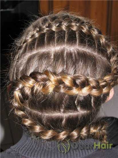 - Плетение нужно начинать не с основания, а от середины головы, после этого делается резкий поворот, далее продолжить заплетать в обратную сторону.