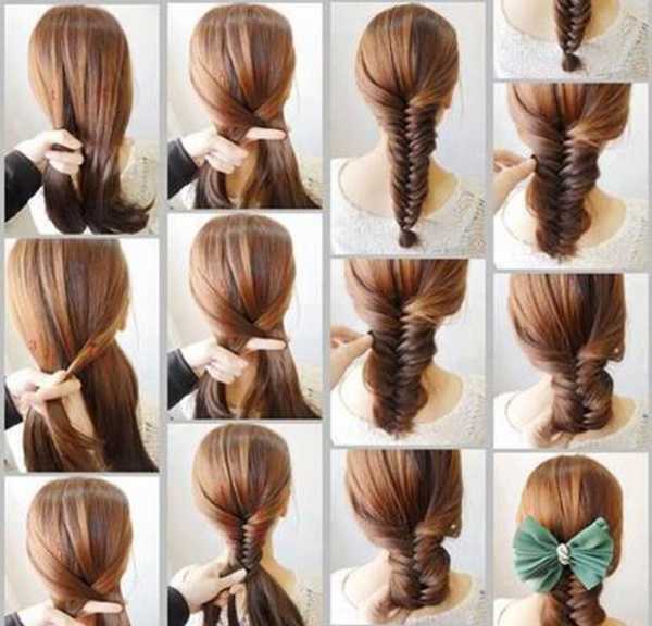 Если пряди у девочки длинные и густые, можно заплести ей прическу рыбий хвост, украсив на конце красивой резинкой, торжественным белым бантом. Плетение такой косы для девочки не займет много времени. Понадобится расческа, резинка, спрей, шпильки.