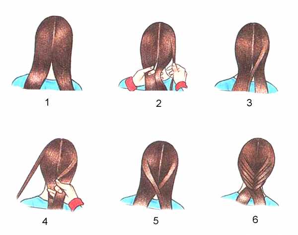 - Зачесываем локоны назад, как на схеме, отделяем сверху у висков по небольшой прядке. Заносим их к затылку, равномерно перекрестив одну под другой.