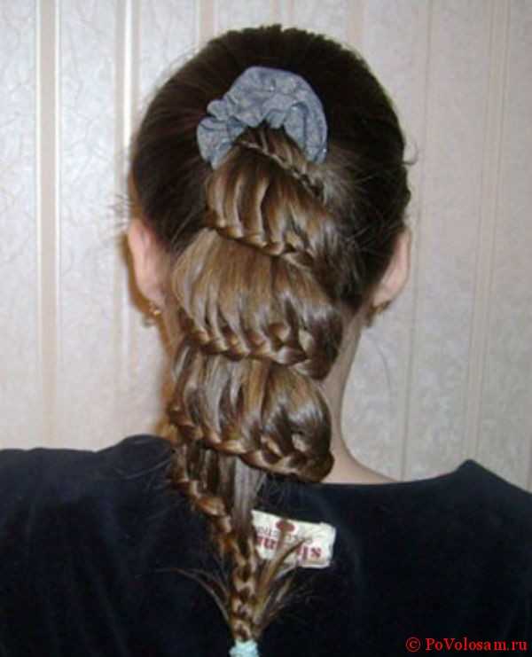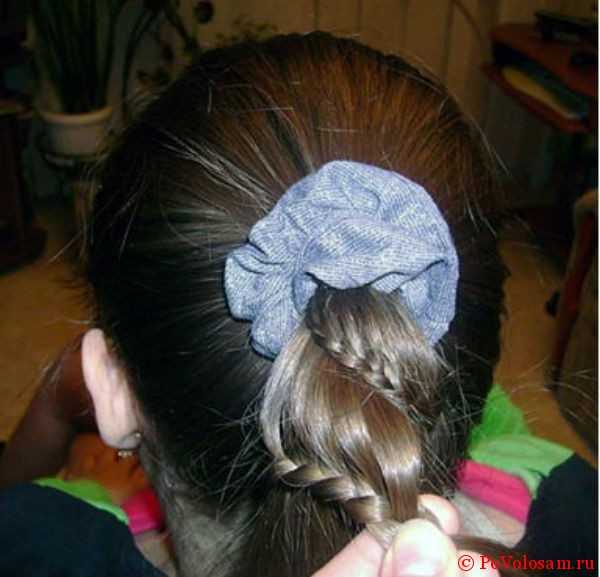 - Правую косу нужно поднять вверх и кончик просунуть под резинку, фиксирующую хвост.