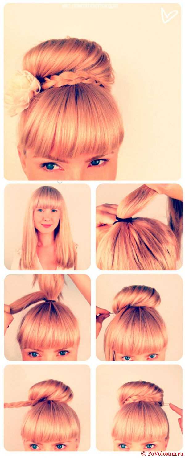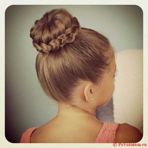 Такая детская прическа из высокого пучка, оплетенного тонкой косичкой, достаточно проста в исполнении, к тому же смотрится эффектно и аккуратно. Ее можно сделать на праздник, торжественный школьный утренник. Понадобятся бублик, 2 тонкие резинки, несколько шпилек для волос. Пряди должны быть средние немного ниже плеч или длинные.
