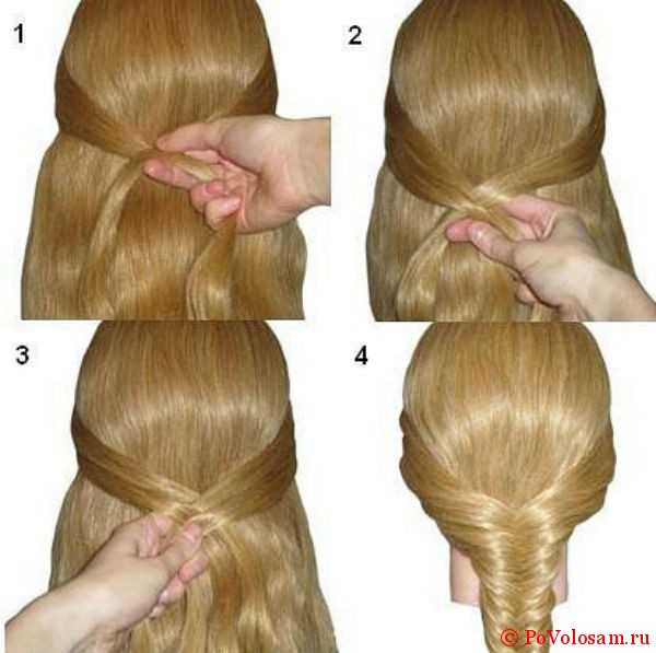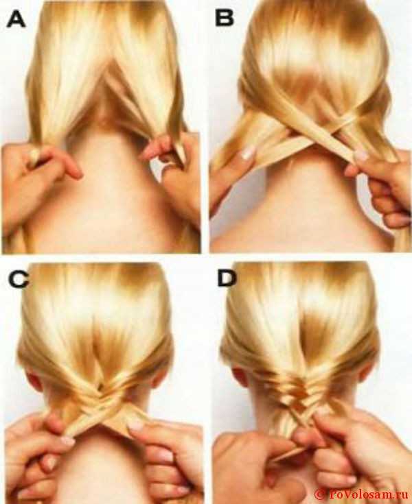Такую прическу делать легко, плетение занимает всего 5 минут. Понадобятся 4 тонкие резинки, невидимки или шпильки.