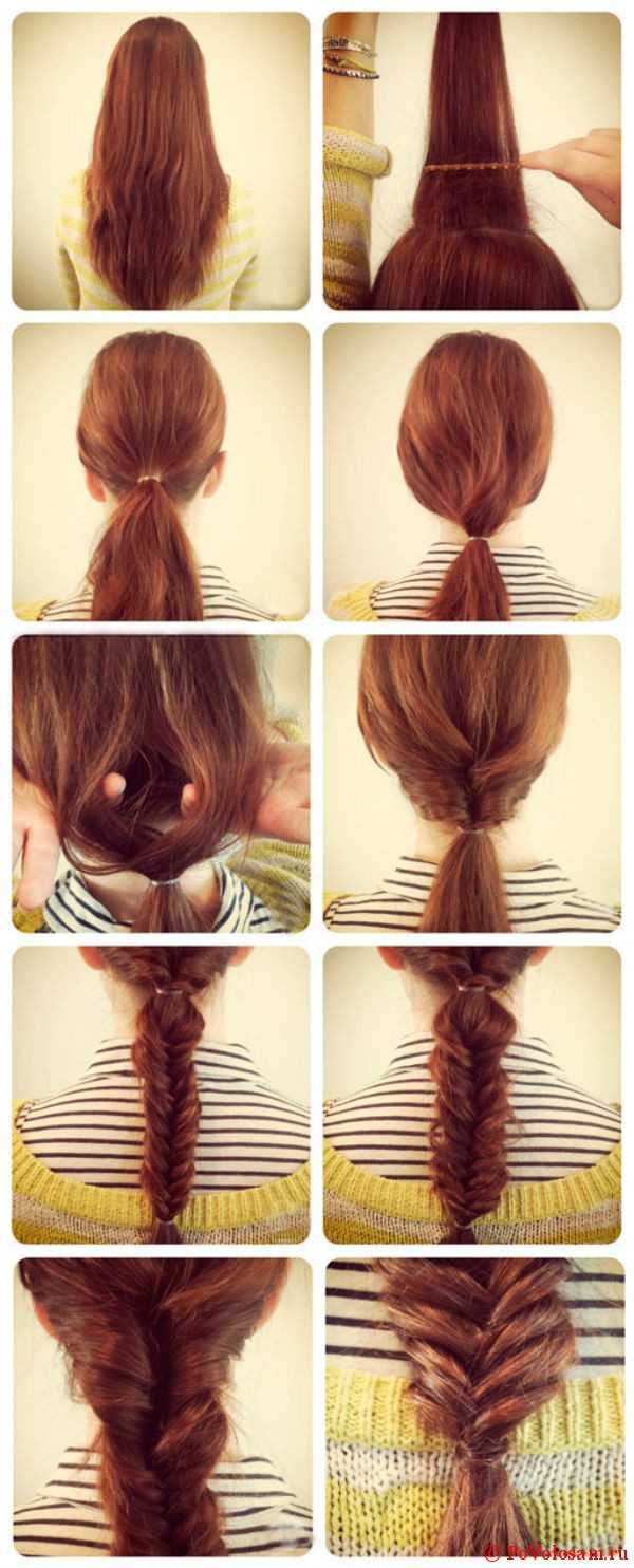 Можно плести рыбий хвост по другому способу, упростив технику. Вариант представлен на фото, занимает меньше времени и усилий. Нужно просто заплести хвост, протащив его через резинку, начать переплетать прядки уже после нее.