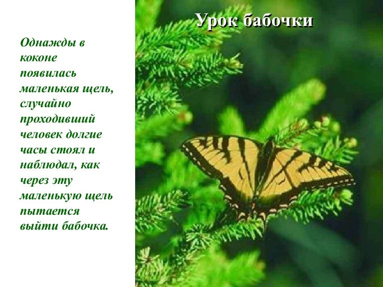Человек, желая помочь бабочке, не понимал: из тела бабочки жидкость должна перейти в крылья; для этого нужны физические усилия, но только при этом условии бабочка сможет выбраться из кокона и полететь.