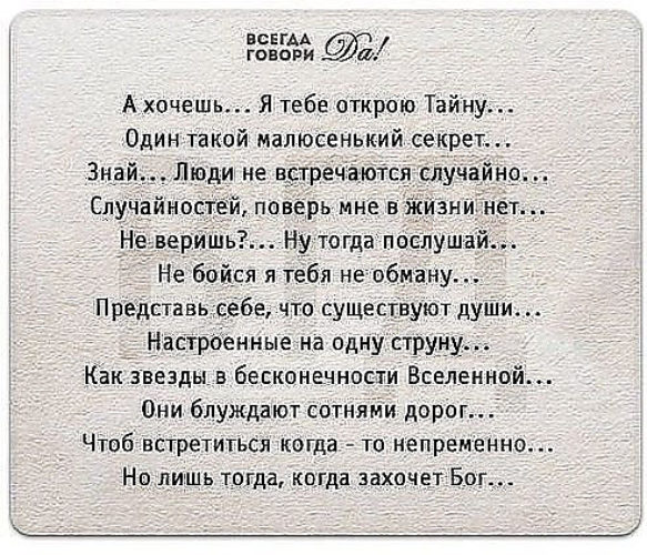 Он слышит, о чем говорит моя душа. Он чувствует, когда сердце ноет. Он видит, когда грустят мои глаза. Он вдохновляет меня, и я могу идти вперед, зная, что Мой Мужчина защитит и поддержит в любую скудную минуту. Я нарочно не называю его имени, о счастье не кричат.