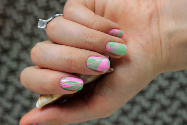 Абстрактные рисунки для коротких ногтей являются одними из самых удачных, так как не имеют четких линий. Самыми оригинальными станут всем знакомые разводы мрамора, которые будут популярны как в своих естественных цветах, так и с использованием несуществующих в природе оттенков. К примеру, на пастельно-бирюзовом сделать линии серебристого цвета.