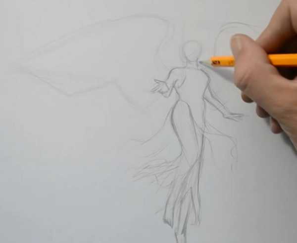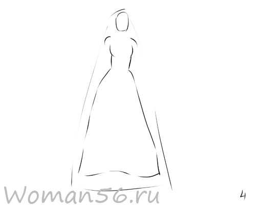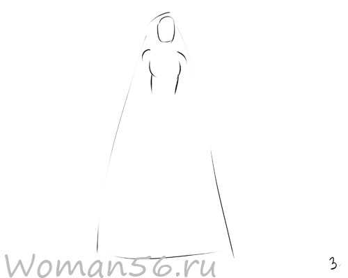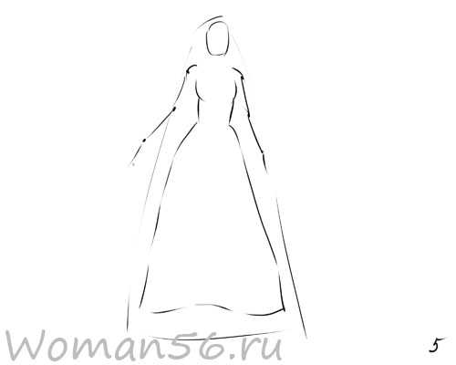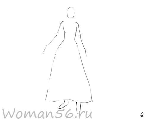 - Заканчиваем рисование наряда с помощью длинных линий. Сам наряд должен расширяться книзу. Ножек под ним, видно, не будет.
