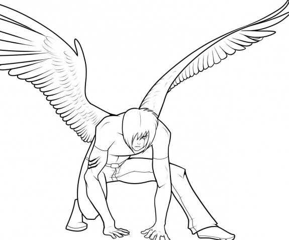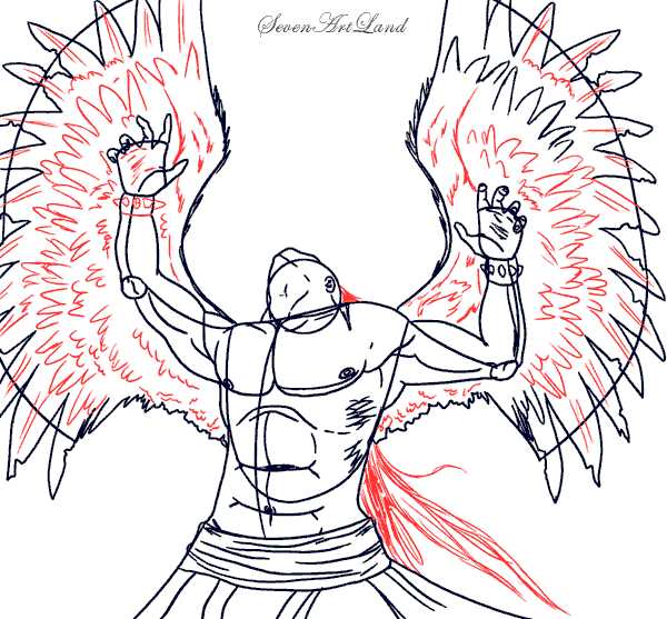 Рисуем правое ухо и показываем складки на шее. Намечаем контуры ключиц и образованные ими складки. Прорисовываем рельеф тела показывая объем мышц груди, рук и живота. Выделяем форму ребер. На левой руке рисуем напульсник с шипами. Дорисовываем пальцы на руках и указываем некоторые складки на ладони все той же левой руки. Очертания крыльев, изображенные в прошлом этапе, соединяем между собой в единый контур. Затем намечаем оперения по их внутренней стороне и рисуем ряд перьев на левом крыле. Вдоль пояса изображаем горизонтальные складки.