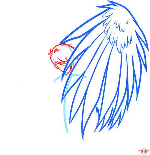 Замечательно, дальше нужно нарисовать лицо и волосы, а затем нарисуйте правое крыло.