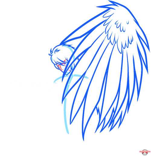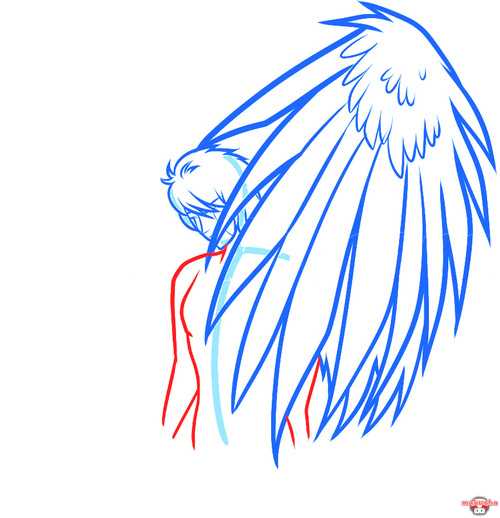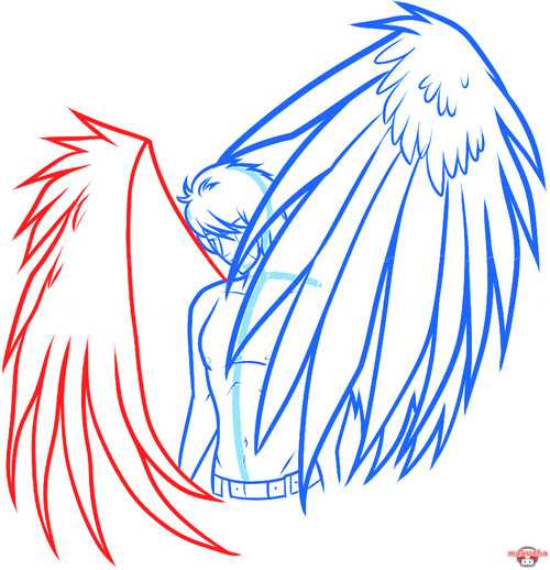 Подчеркните форму заброшенной назад головы. Нарисуйте талию. На основании вспомогательных линий рисуем очертания рук и их больших пальцев. Изображаем форму крыльев, указывая контуры перьев внизу. Из одежд выделяем пояс.