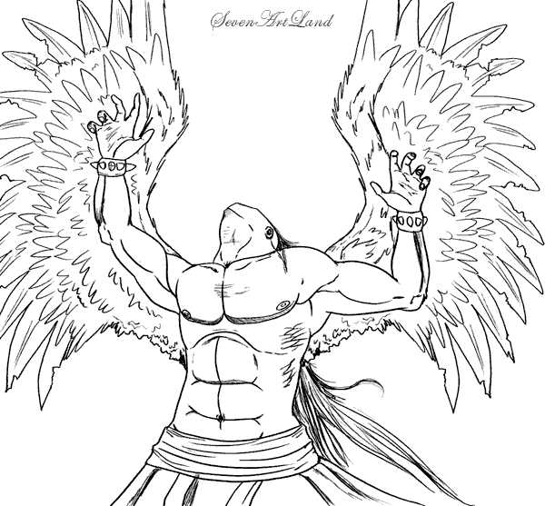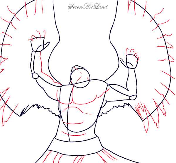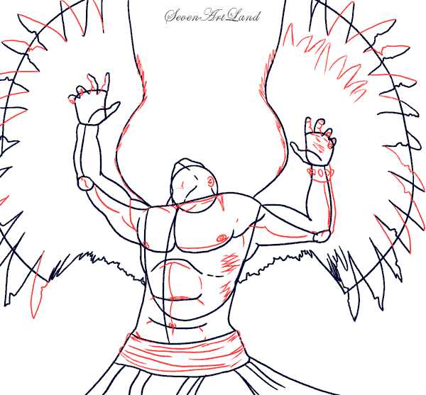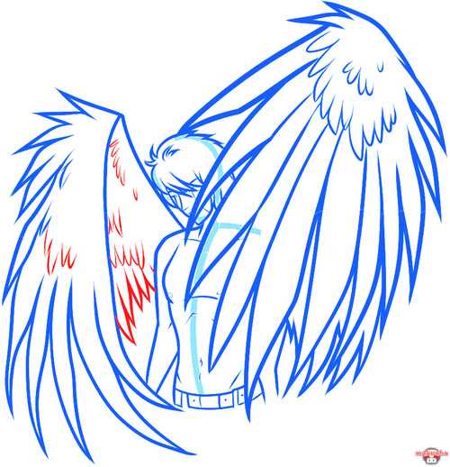 Определяем шею и подбородок. Рисуем формы груди и складки живота. Дорисовываем форму правой руки и намечаем контуры пальцев на кистях. По внешнему контуру крыльев рисуем очертания перьев. Здесь не нужно стараться передать все в точности, как на рисунке. Достаточно приблизительно расположения основных линий. Показываем складки на одежде.