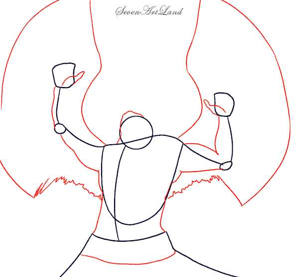 - Изображаем верхнюю часть туловища с помощью линий, направленных вниз. Нижнюю часть одеяния изображаем наклонными отрезками.