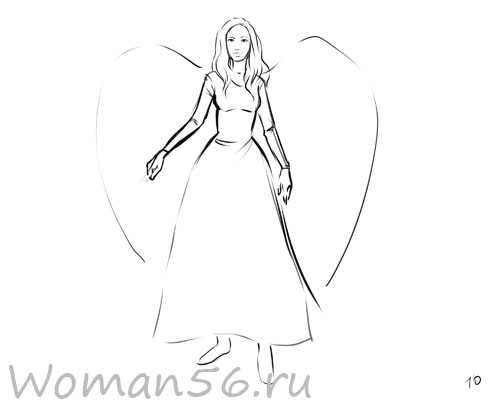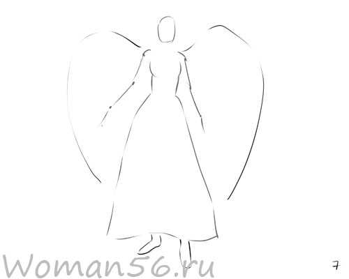 На этом этапе нужно затереть ластиком туловище ангела, а потом опять обвести четко контур рисунка – туловище, ноги, руки и платье.