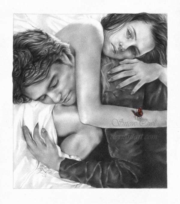 Убираем лишние линии, остальное — наводим сильнее. Добавляем детали: изгибы локонов у Беллы, складки в изгибе локтя у Эдварда.