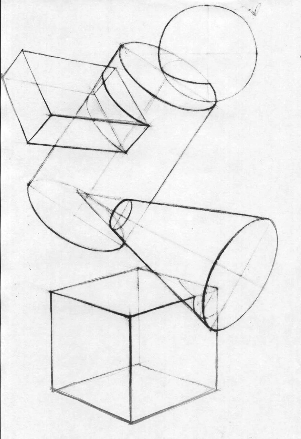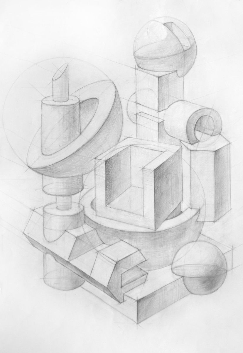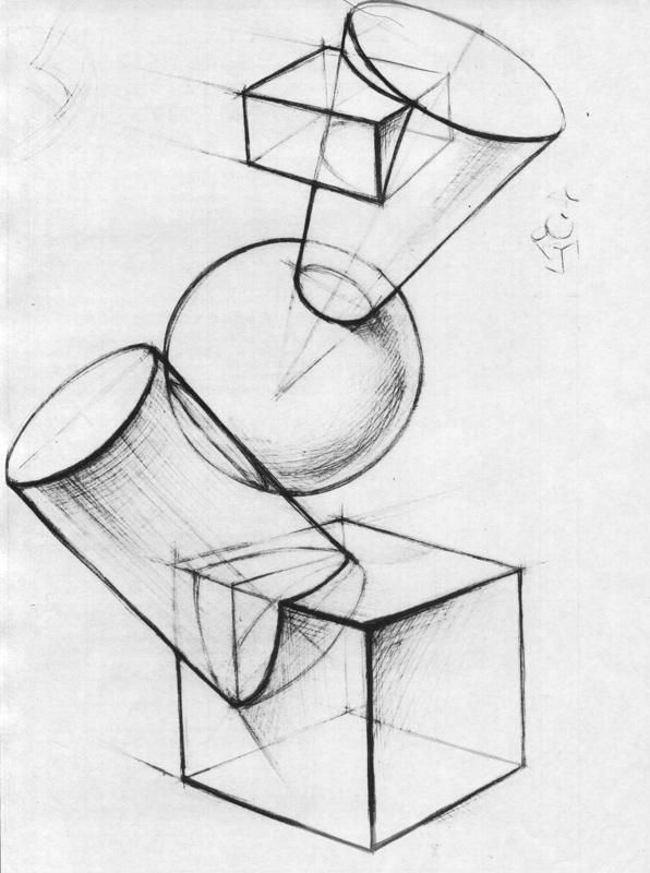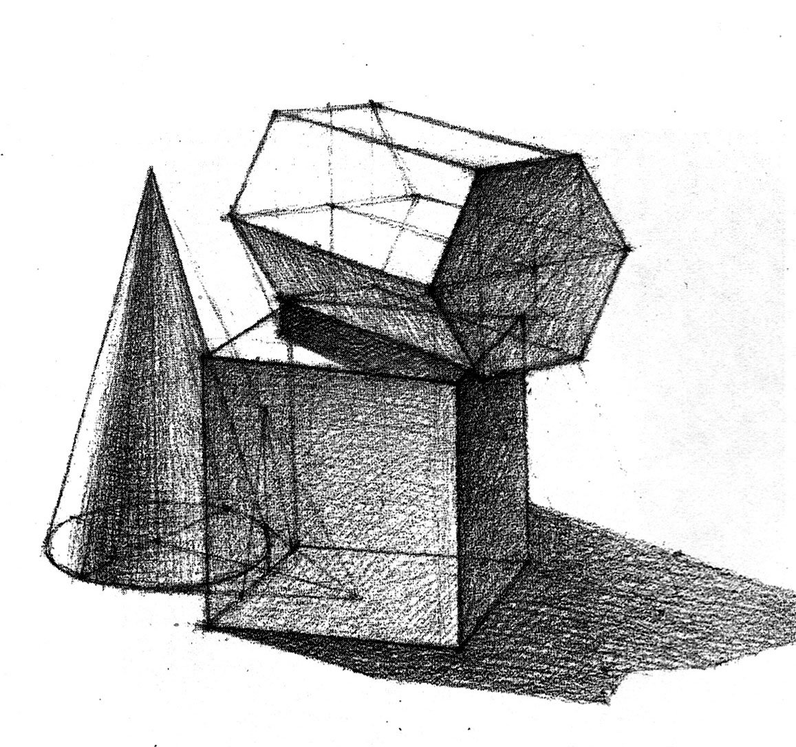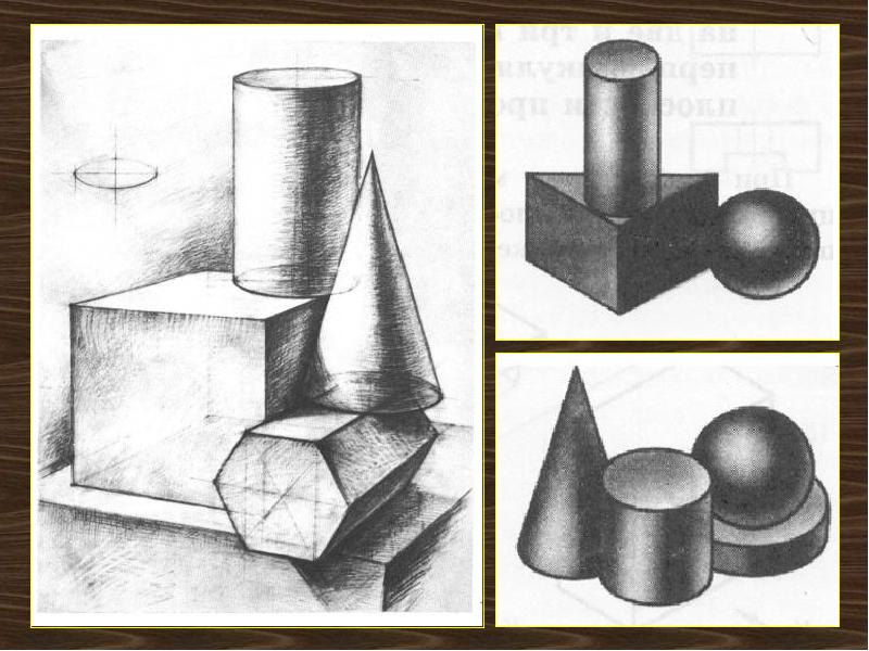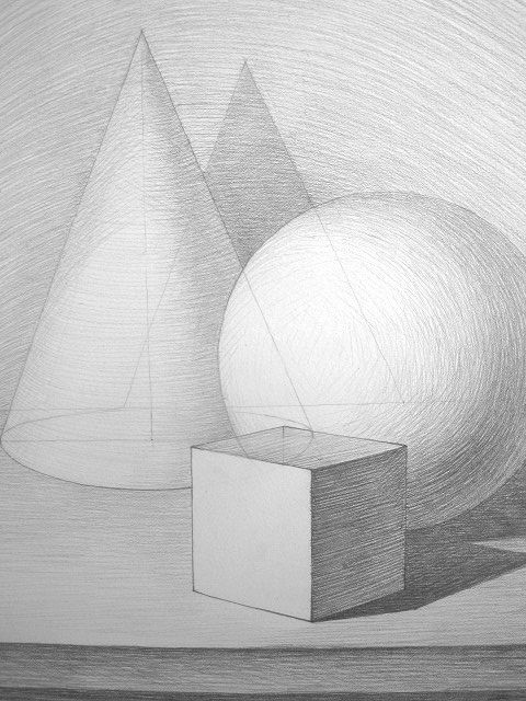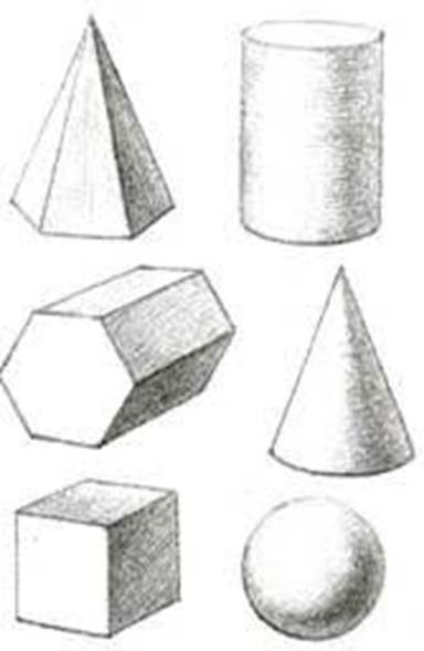 Наиболее подходящей формой для усвоения принципов построения рисунка являются геометрические тела , имеющие в своей основе ясные конструктивные строения. На простых геометрических телах легче всего понять и усвоить основы объемно-пространственной конструкции, передачи форм в перспективном сокращении, закономерности светотеней и пропорциональные соотношения.