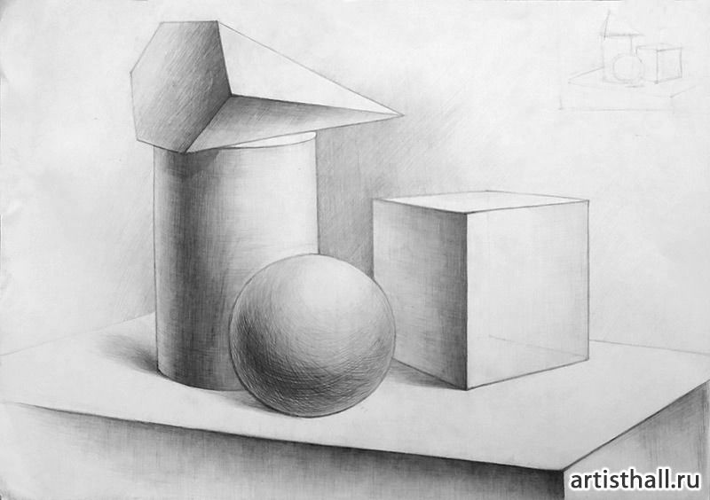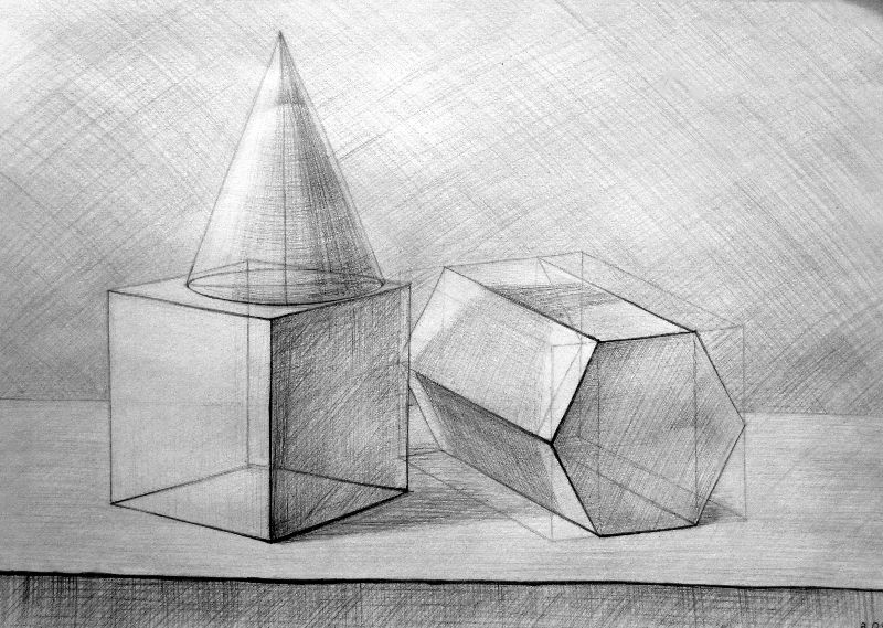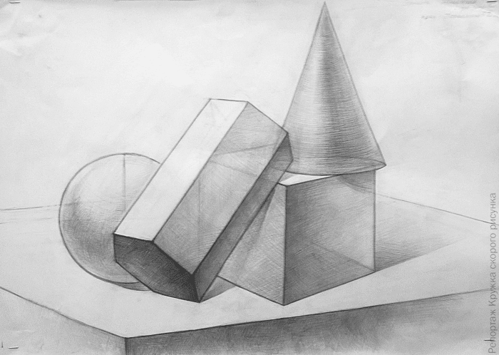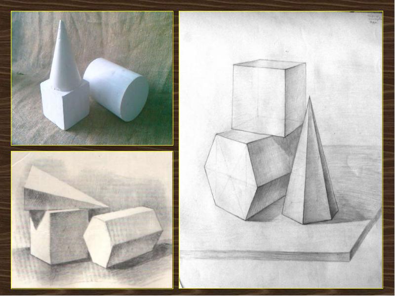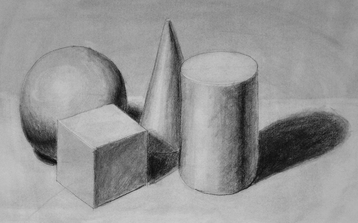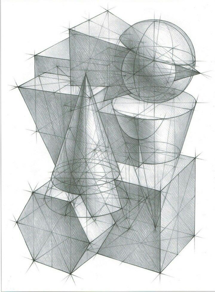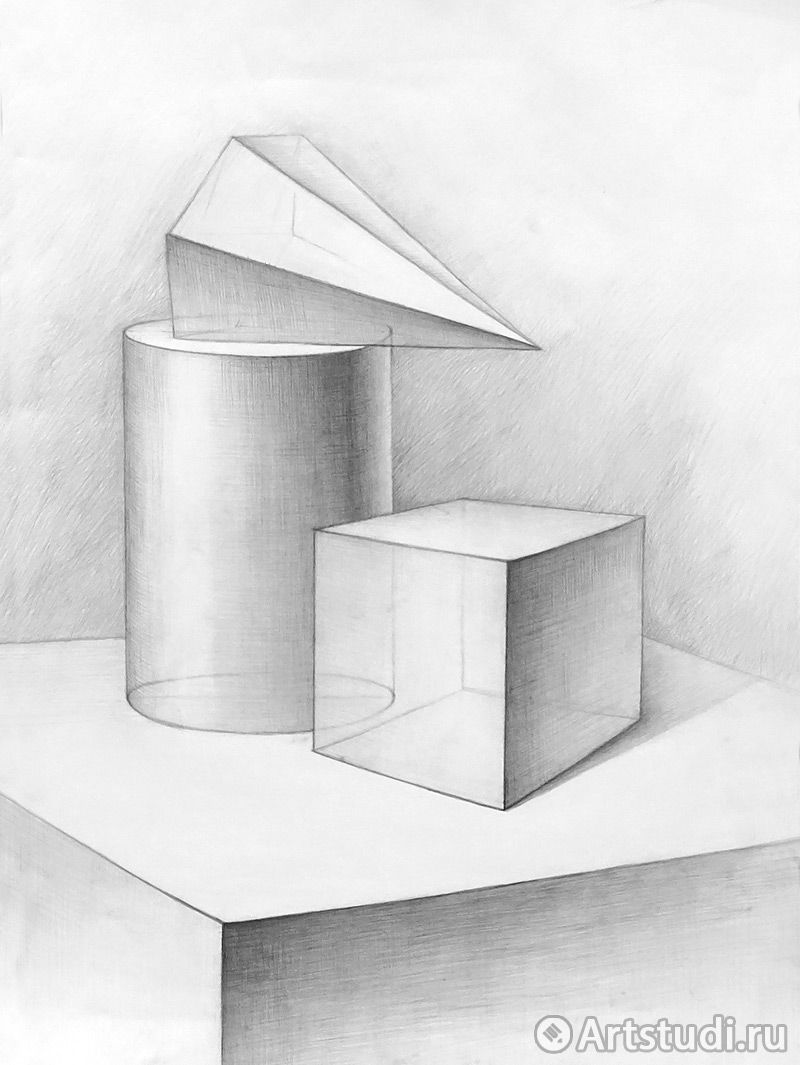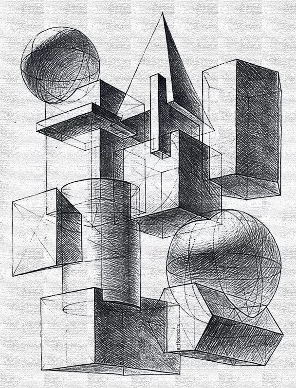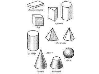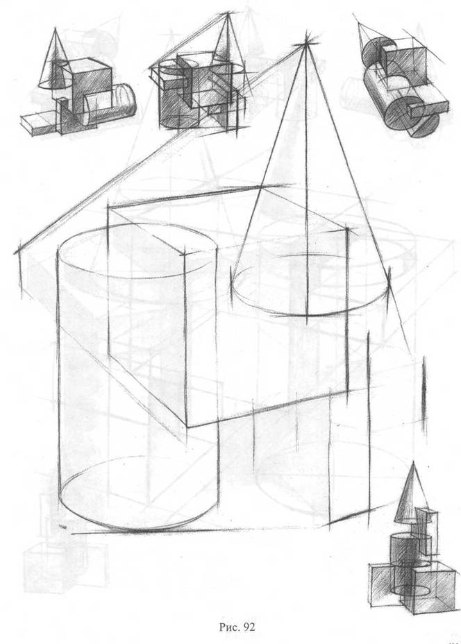 Наиболее подходящей формой для усвоения принципов построения рисунка являются геометрические тела , имеющие в своей основе ясные конструктивные строения. На простых геометрических телах легче всего понять и усвоить основы объемно-пространственной конструкции, передачи форм в перспективном сокращении, закономерности светотеней и пропорциональные соотношения.