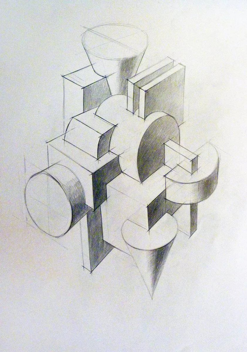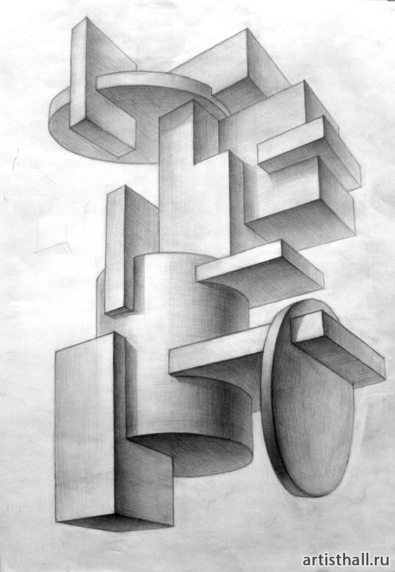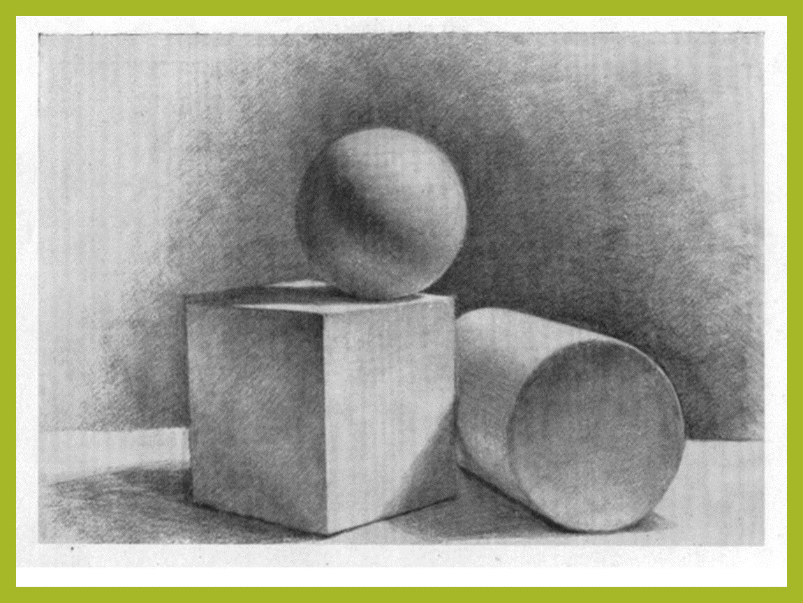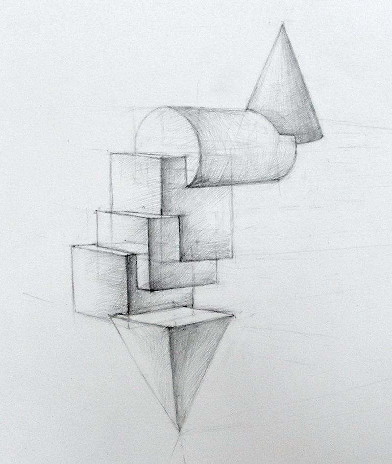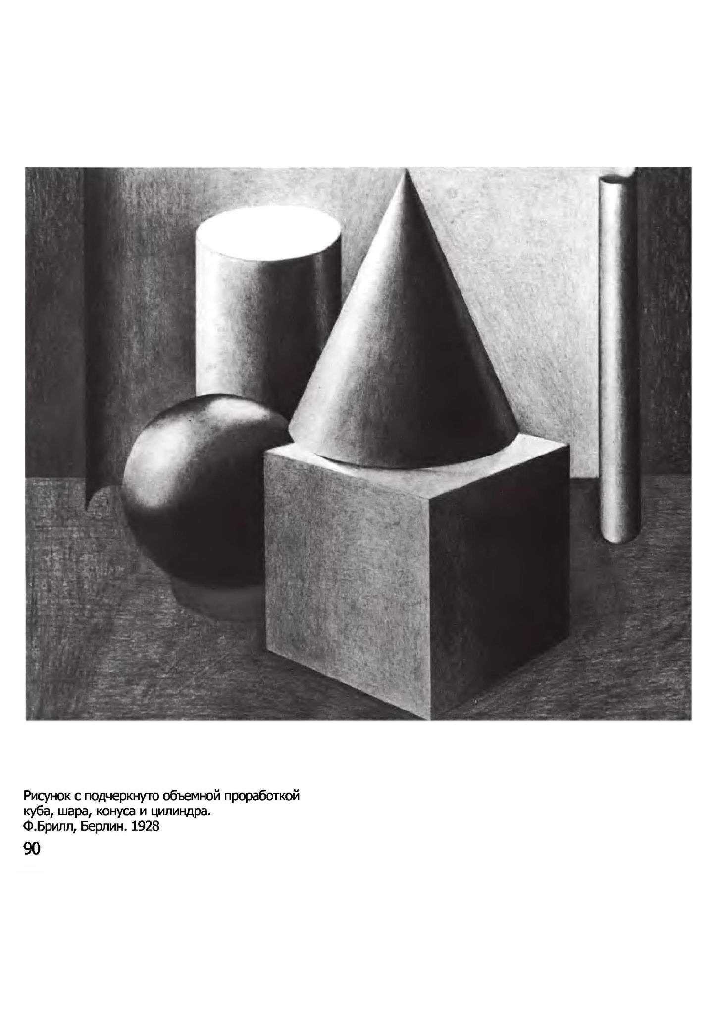 Наиболее подходящей формой для усвоения принципов построения рисунка являются геометрические тела , имеющие в своей основе ясные конструктивные строения. На простых геометрических телах легче всего понять и усвоить основы объемно-пространственной конструкции, передачи форм в перспективном сокращении, закономерности светотеней и пропорциональные соотношения.