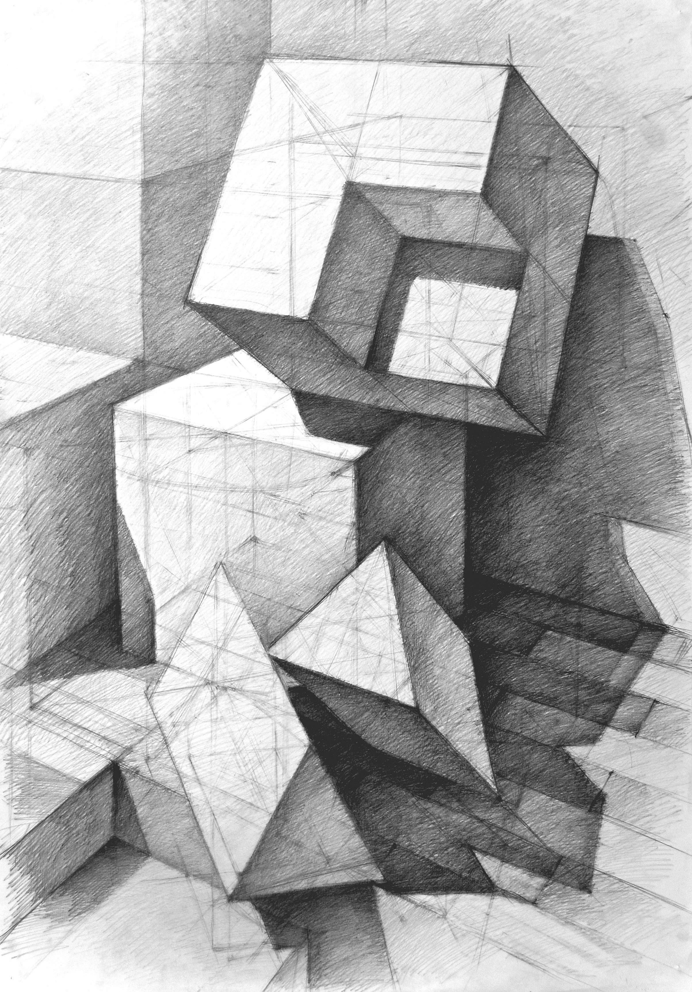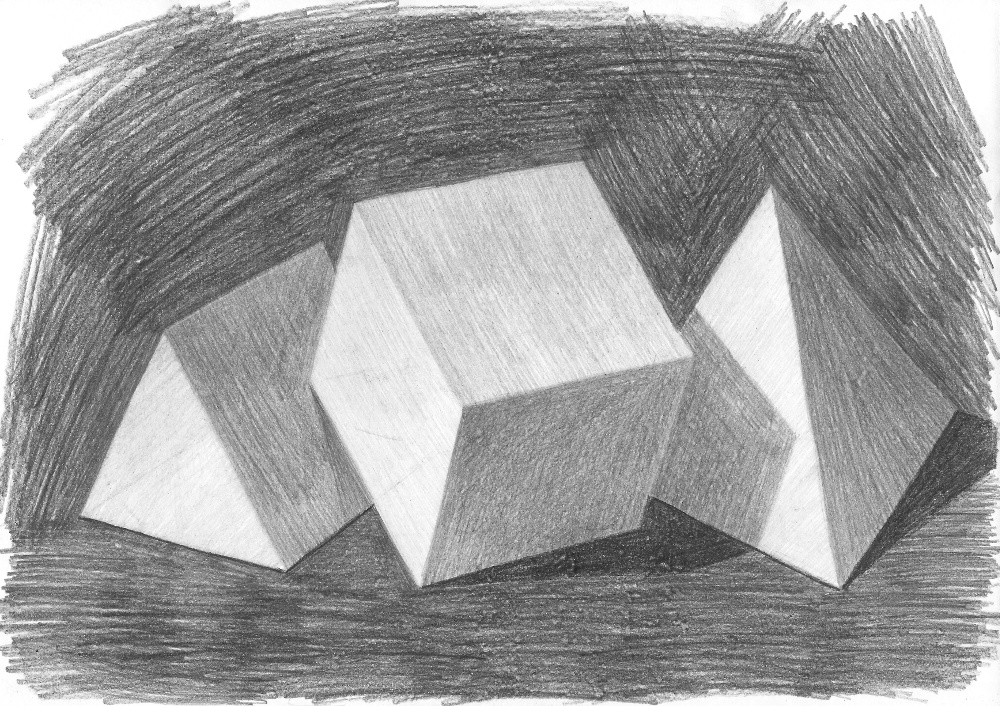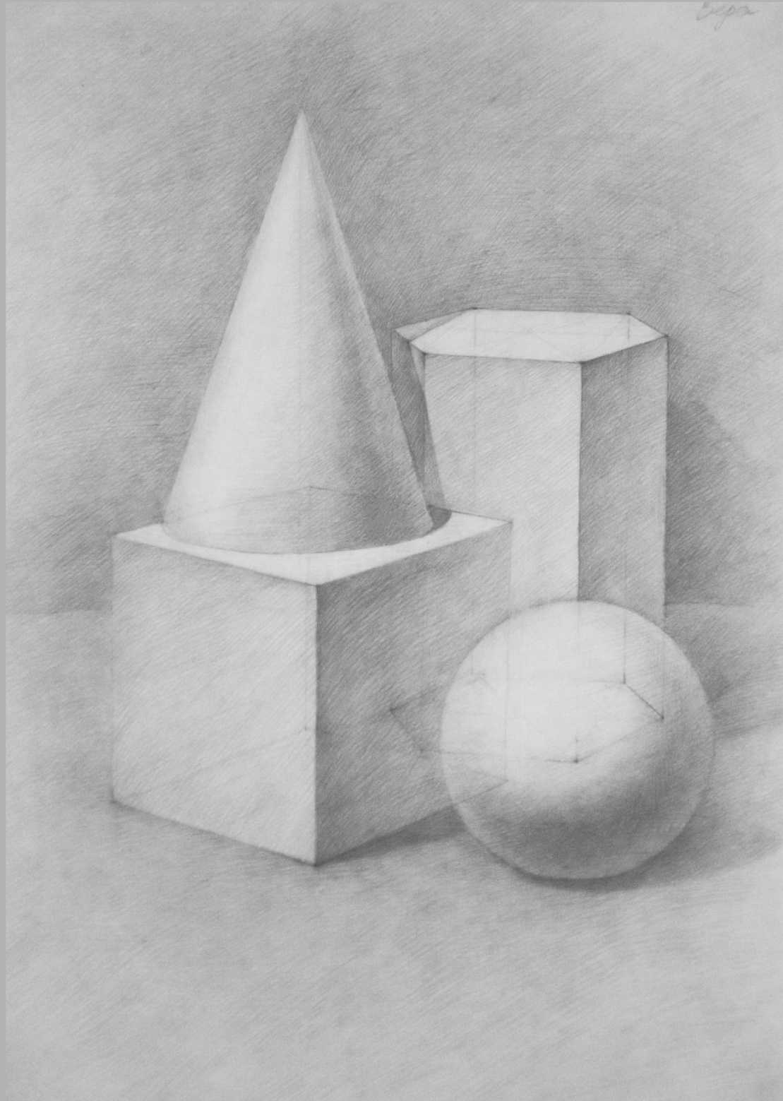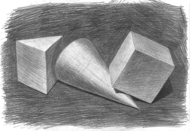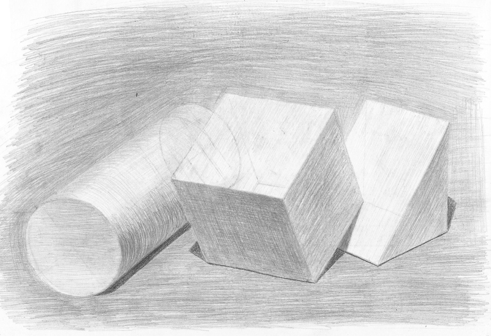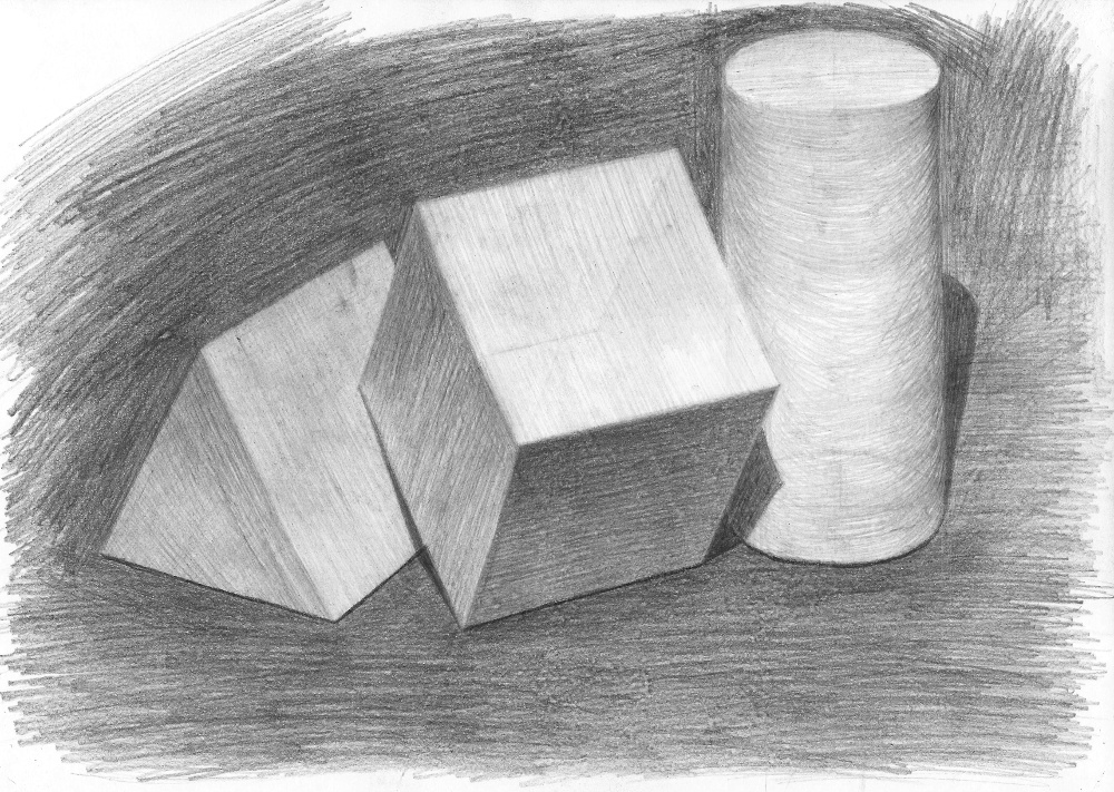 В общих чертах разберемся с концепцией учебного тонального рисунка объемных фигур. При нанесении тона в учебном рисунке объемных фигур важно сконцентрироваться на создании иллюзии объема и пространства. Первое достигается путем соблюдения общих основ теории теней. Здесь важно отметить, что при учебном рисовании объемных фигур желательно использовать штриховку по форме этих самых фигур и по направлению теней. Ощущение пространства в учебном рисунке достигается увеличением контрастности светотеневых градаций на переднем плане и смягчением теней на заднем плане.