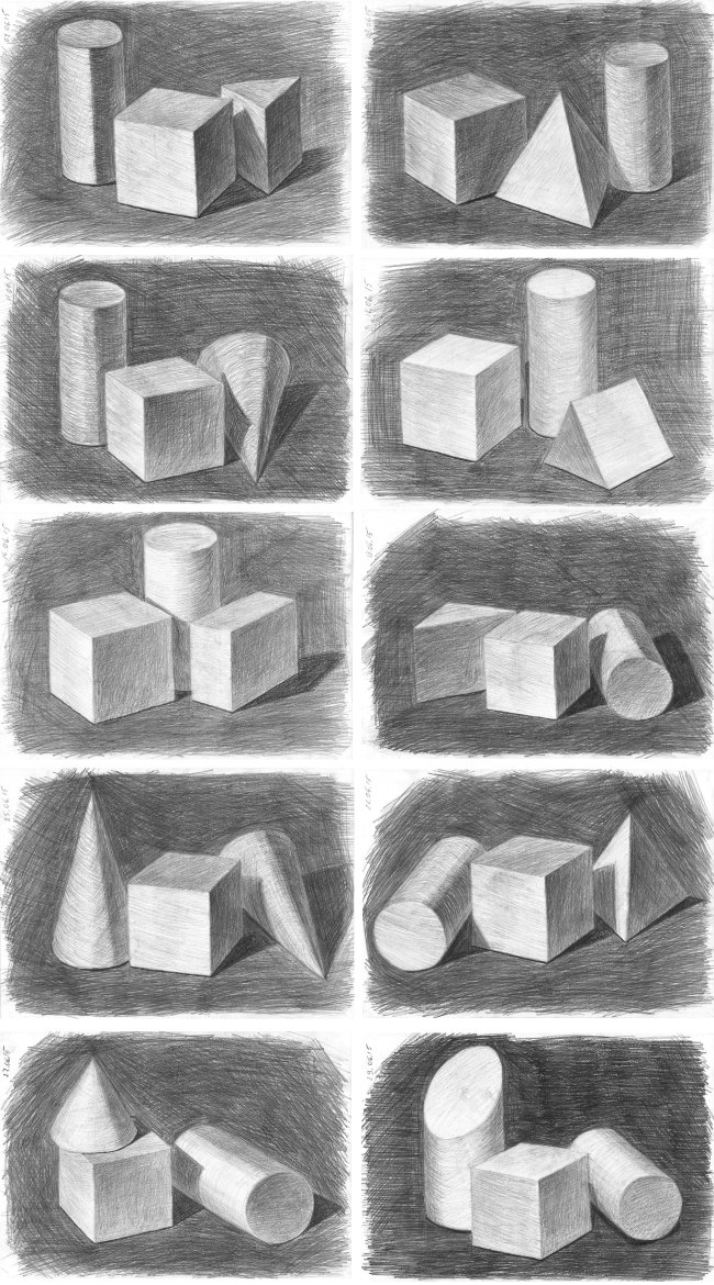 Упражнения по рисованию простых геометрических тел позволяют не отвлекаться на детали, имеющиеся в более сложных формах, таких, как архитектурные объекты и тело человека, а всецело сосредоточиться на главном – изобразительной грамоте.
