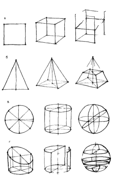 Для основательного изучения геометрические формы лучше всего следует рассматривать в виде прозрачных каркасных моделей. Это позволяет лучше проследить, понять и усвоить основы пространственного построения конструкций и перспективного сокращения форм геометрических тел: куба, пирамиды, цилиндра, шара, конуса и призмы. Вместе с тем, такой прием в значительной степени облегчает построение рисунка, в котором отчетливо прослеживаются все пространственные углы, ребра, грани тела, независимо от их поворотов в пространстве и в перспективном сокращении.