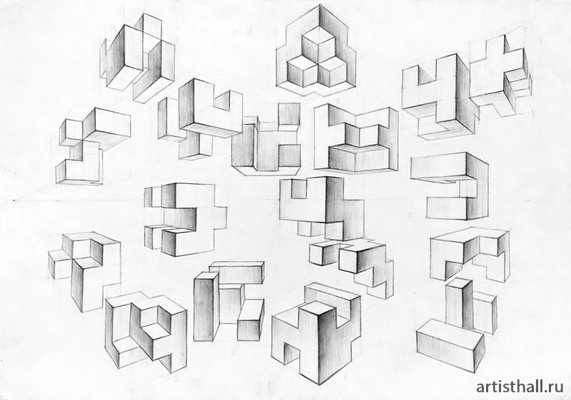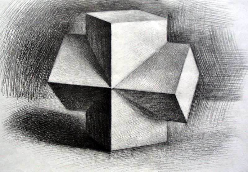 Например, в рисовании куба нужно точно определить перспективные сокращения и нарисовать от руки, без вспомогательных средств, ровные его грани. А, в рисовании шара, важно нарисовать правильный круг, опять же без дополнительных подручных средств. Только карандаш, бумага и стёрка.Особенности построения объемных фигур