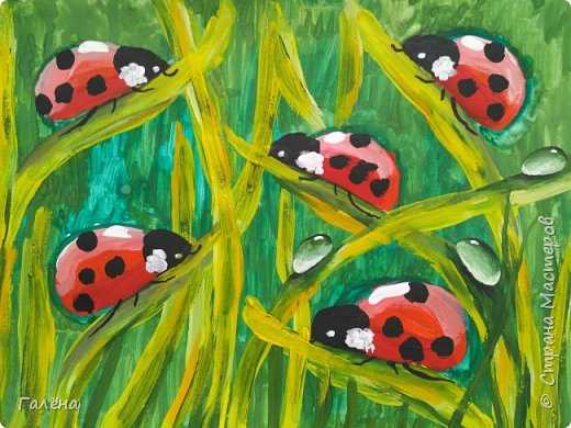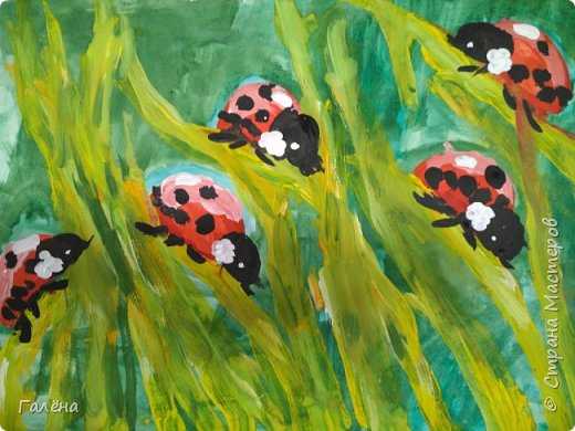 Светлой желтой гуашью рисуем под б.коровками травинки,тянущиеся к солнышку.