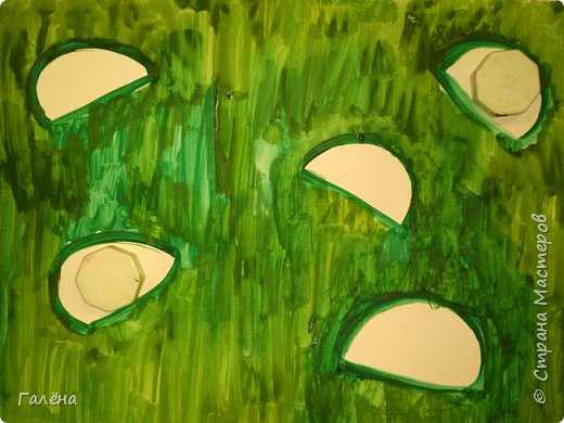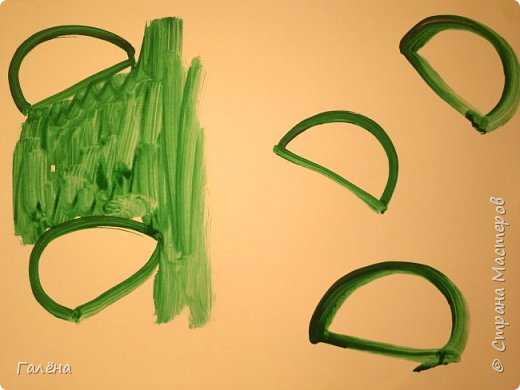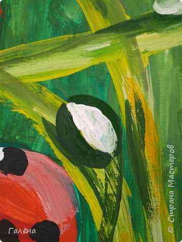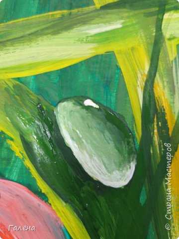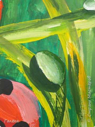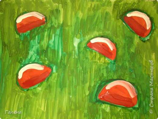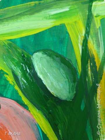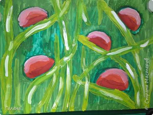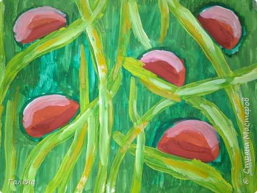 Трех капелек мне показалось достаточно.А вот последние мазки темно зеленой гуашью показались грубоватыми.Я их слегка успокоила желтой гуашью.