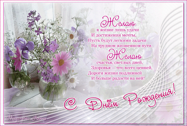 Ваша энергия, душевный оптимизм, бодрость духа и неизменная улыбка вдохновляют видеть радость в каждом дне. Вы пример прекрасной женщины, которая окружает любовью и заботой всех вокруг, в ваших руках спорится любое дело, ваш золотой характер редкое качество человека широкой души. От всего сердца поздравляю Вас и желаю Вам счастья, добра и всех благ! ©