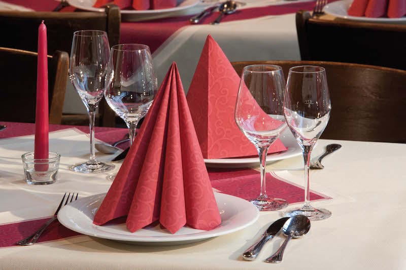 Сервировка стола салфетками зависит от количества посуды, перемен блюд и вида трапезы. Каждый случай предполагает особенный вариант использования и складывания салфеток, согласно этикету.