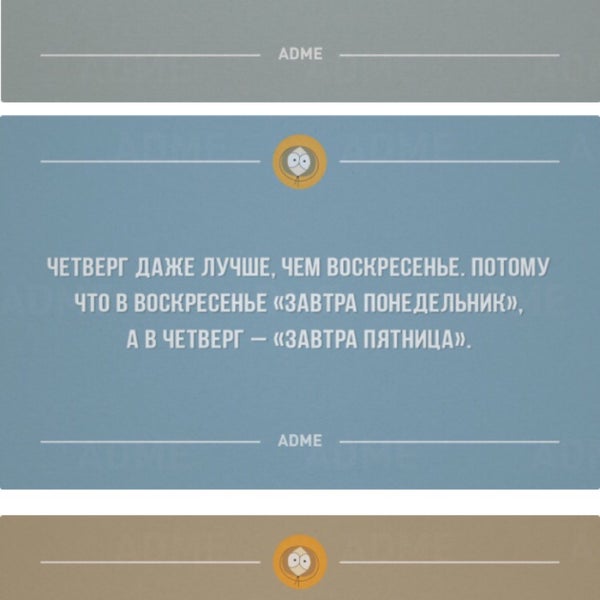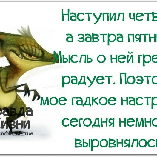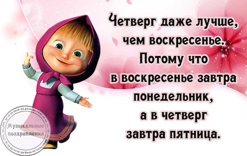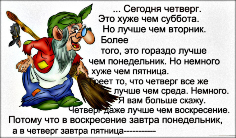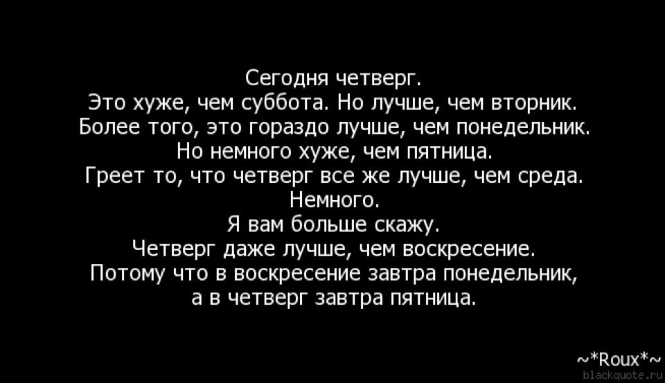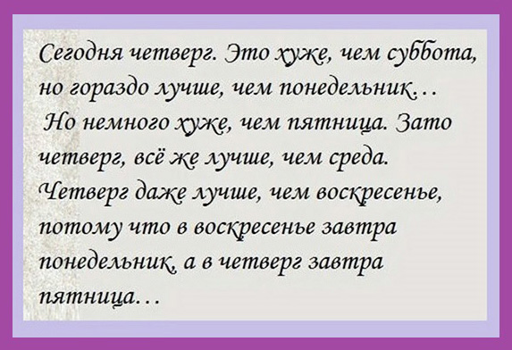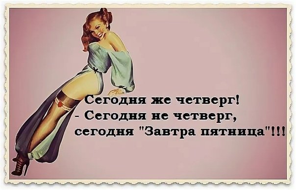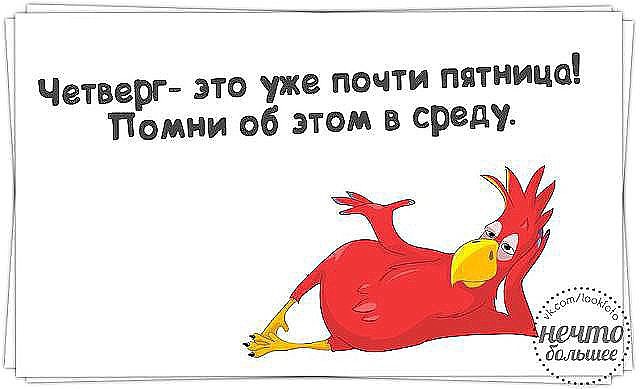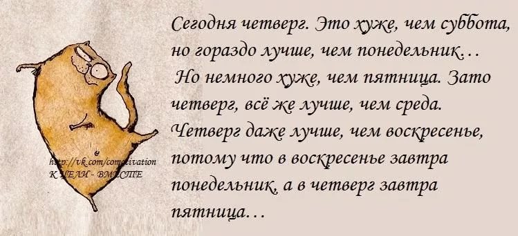 *** Четверг — рыбный день! Нужно поймать Русалку, чтобы с ней провести досуг!!! *** Если начать тусить в четверг, то будет четыре выходных. *** Четверг — это почти пятница! — Помни об этом в среду на работе! *** Человека формирует среда, а он формирует ее с четверга по вторник. *** Четверг даже лучше чем воскресение. Потому что в воскресенье завтра понедельник, а в четверг завтра пятница.