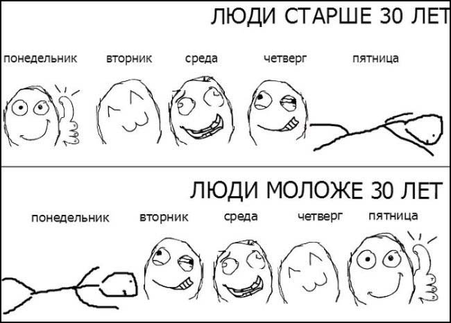 Если вы четвертый день не высыпаетесь, значит сегодня четверг! *** Если среда — маленькая суббота, почему б четвергу не стать хотя б немножко воскресеньем. *** Что будет, если по пятницам запретят продавать алкоголь? *** — Хорошо, что сегодня пятница! Можно нормально посидеть, отдохнуть. *** Эх, люблю такие четверги, которые пятницы. *** Проснулся в пятницу веселый, настроение супер, и тут на те, сказали что сегодня четверг.
