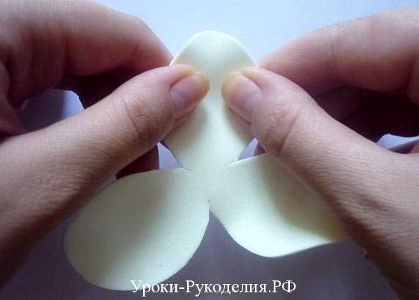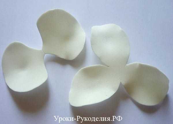 - Вырезаем из фоамирана 3 маленьких лепестка, придав утюгом чуть изогнутую форму;