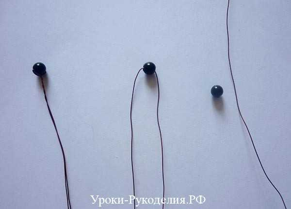 Каждую бусину нанизываем на проволоку и закрепляем, скручивая концы. Длина проволоки в сложенном виде должна быть около 8 см, то есть общая длина около 16 см.
