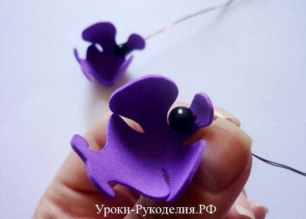 Шилом делаем отверстие в двойных лепестках посередине и нанизываем их на проволоку. Наносим клей с обратной стороны фиолетовой серединки в области проволоки и скрепляем два слоя фоамирана.