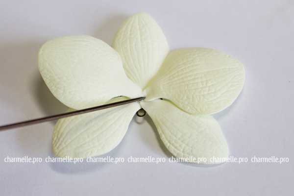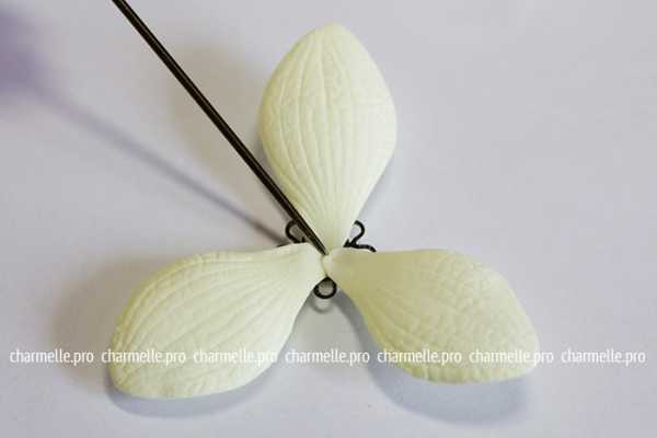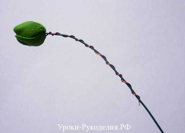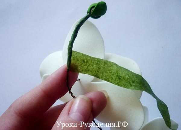 Так как все фрагменты орхидеи готовы, начинаем сборку. Берём флористическую проволоку и наматываем на неё только что сделанный бутончик. Конец этой проволоки должен упираться в основание бутона.