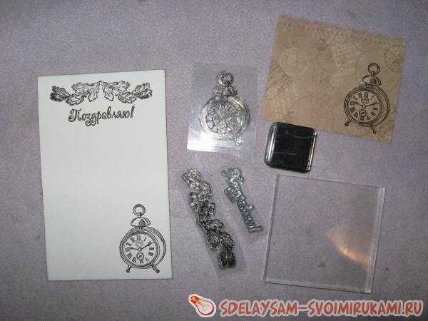• Штампы акриловые: завиток, часы, «Поздравляю»;