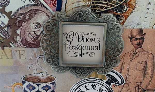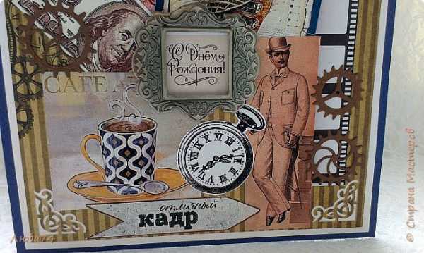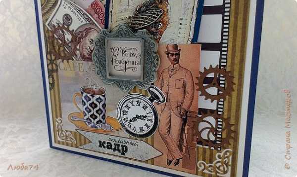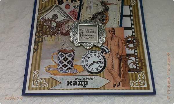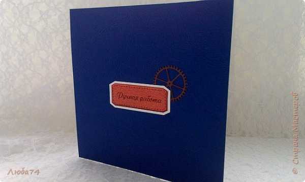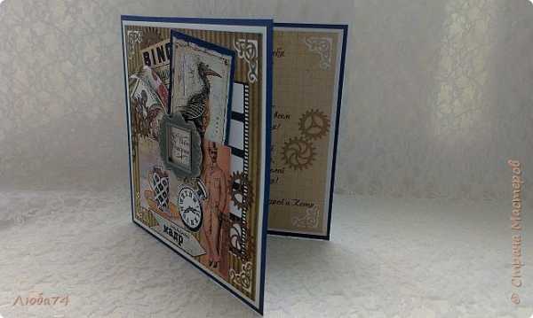 Размер открытки 15х15 см, основа темно-синий картон для обложек с эффектом под кожу, бумага для скрапбукинга, распечатанные картинки в мужской тематике, вырубка шестеренки, ажурная металлическая рамочка, надпись Артема Лебедева.