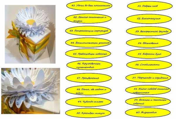 Очень простым, но эффективным вариантом станет цветок с пожеланиями. За основу можете взять идеи со цветиком-семецветиком.