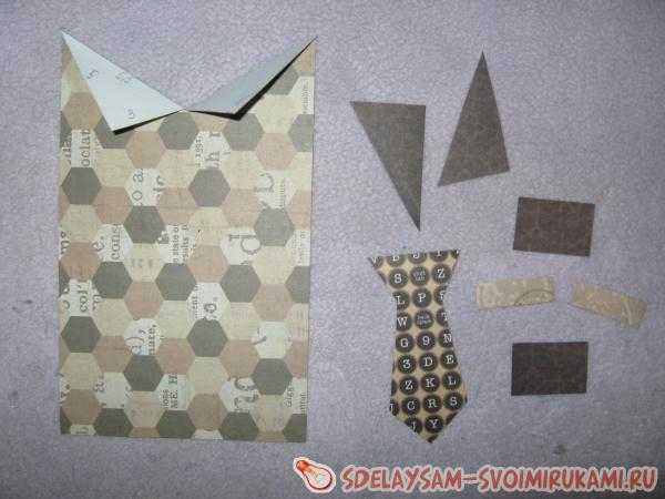 Из другой бумаги вырезаем уголки для воротника и карманы, из третьей бумаги вырезаем галстук. Из акварельной бумаги вырезаем 9,5*15,5 см прямоугольник, а для внутреннего кармана вырезаем прямоугольник 8,5*9,8 см. Делаем бумажные кружева дыроколом.