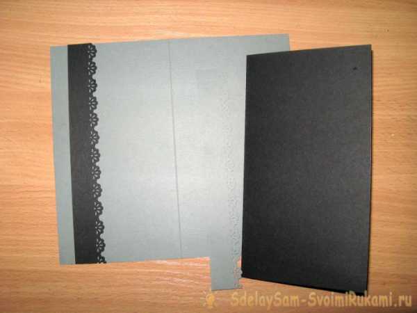 Из скрапбумаги вырезаем по два прямоугольника на каждую открытку 8,2*12,2 см. По одному клеим на задние части открыток.